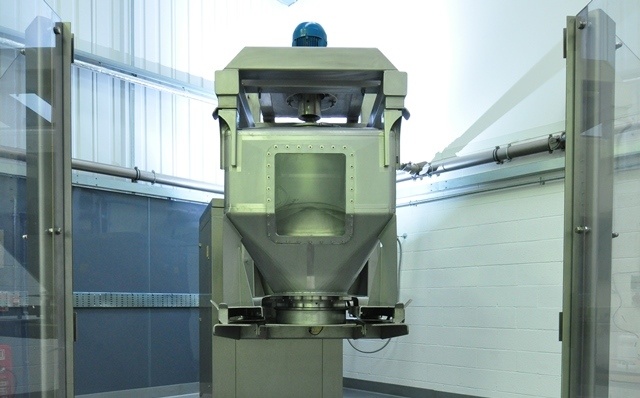 An IBC has already been formulated ready for blending offline from the blender. It will then be clamped into the tumble blender and rotated to mix the powder ingredients. The IBC can then be taken from the blender and loaded onto a discharge station connected to a powder packer which will fill pouches/tubs.